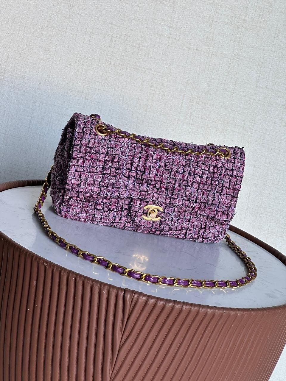 Crafted from an exquisite bouclé tweed fabric, the texture is authentically replicated, mirroring the precise weight, feel, and visual depth of the original. Woven throughout are the signature iridescent threads that catch the light with every movement, creating a captivating play of dimension and luxury. The iconic interlocking CC turn-lock, plated in gleaming antique gold-tone hardware, serves as the centerpiece, ensuring flawless closure and undeniable authenticity.