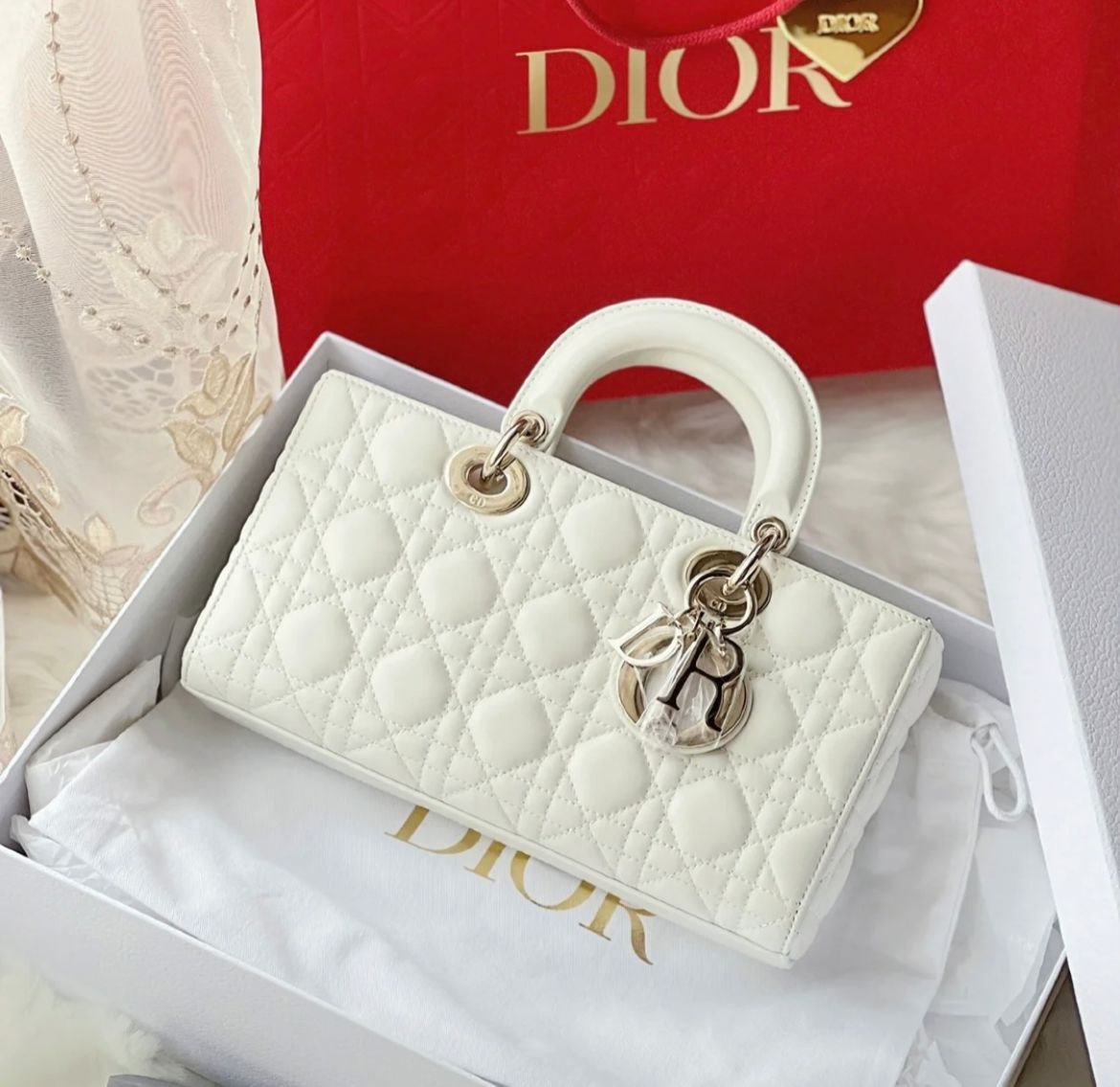 The bag is elegantly secured by a polished gold-tone ‘CD’ clasp, a modern emblem that clicks satisfyingly into place. The versatile adjustable chain strap, elegantly woven with leather, allows for multiple wearing styles: carried elegantly in the hand, worn as a chic shoulder bag, or crossbody for effortless mobility.