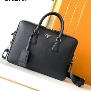 Crafted with precision and sophistication, the PRADA Saffiano Leather Briefcase in classic black epitomizes luxury and functionality. Made from durable Saffiano leather, known for its cross-hatch texture and scratch-resistant finish, this briefcase ensures long-lasting elegance. The sleek design features gold-tone hardware, a top handle, and an adjustable, detachable shoulder strap for versatile carrying options.