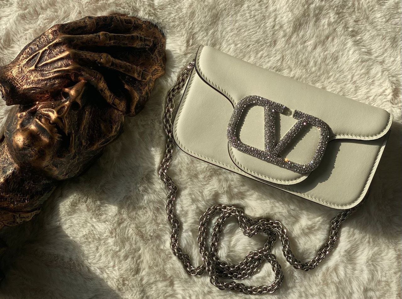 Features iconic Valentino gold-tone or silver-tone signature hardware.