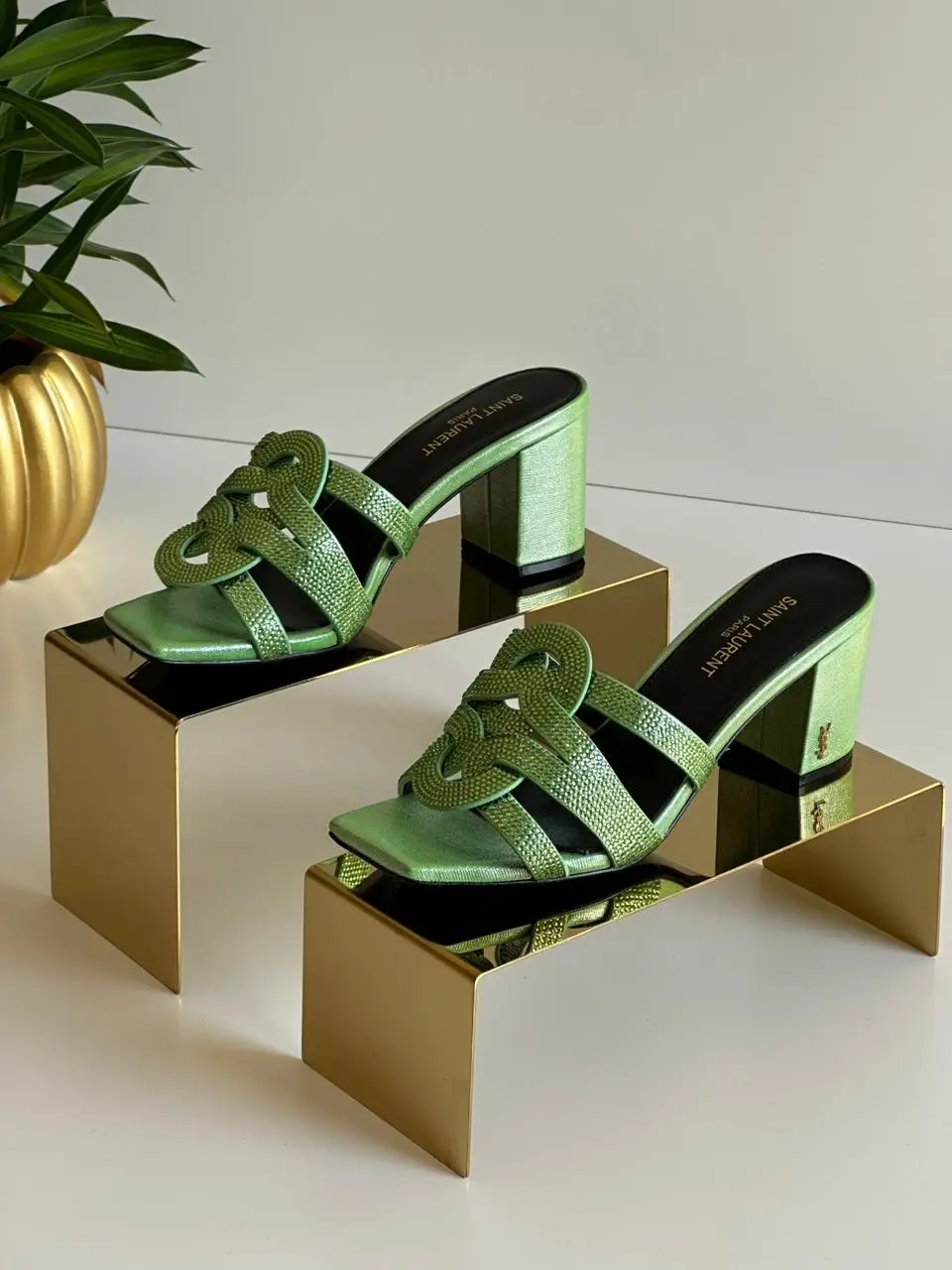 Step into sophistication with the YSL Tribute Heeled Mules, a luxurious masterpiece from Saint Laurent. These exquisite mules feature a sleek patent leather finish, a signature YSL logo plaque, and a sculptural heel that exudes confidence and femininity. Designed for the modern fashionista, the comfortable yet elevated heel height ensures effortless style, whether for a night out or a polished daytime look.